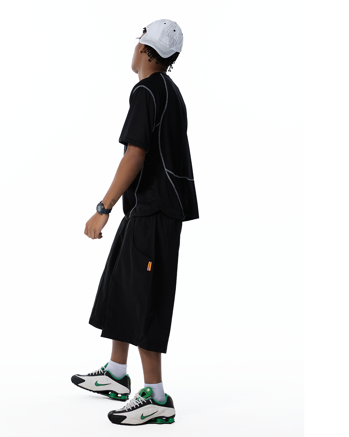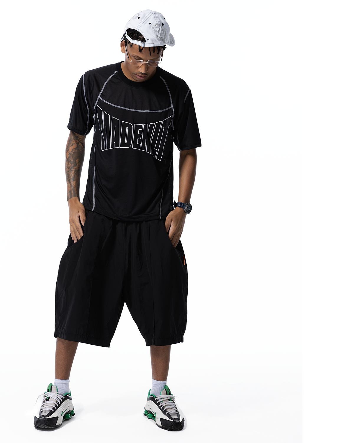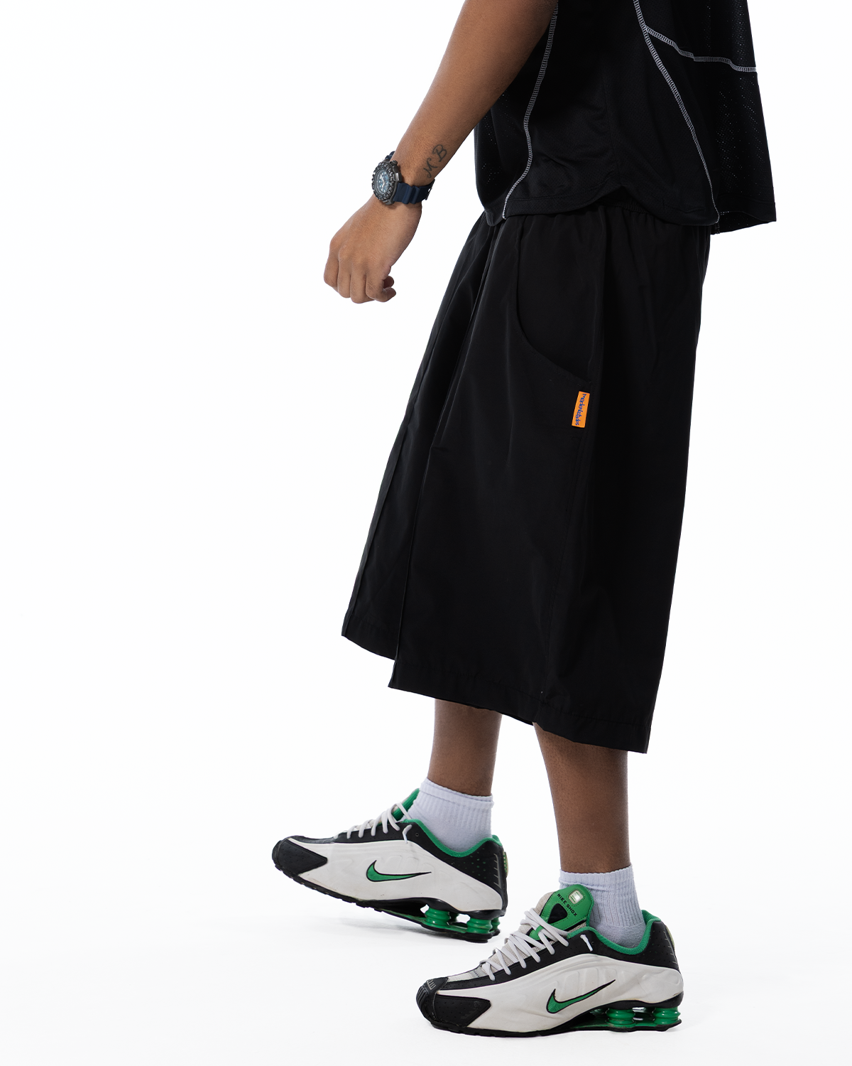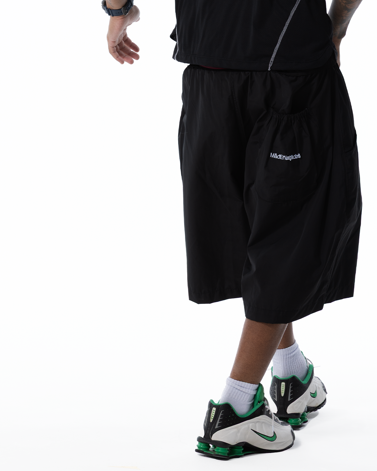 Bermuda preta em tecido tecnológico de secagem rápida com modelagem longa e vinco nas partes da frente, dois bolsos frontais e um bolso traseiro com elástico e bordado. Cós com elástico e cinto com ajuste metálico personalizado Mad Enlatados.