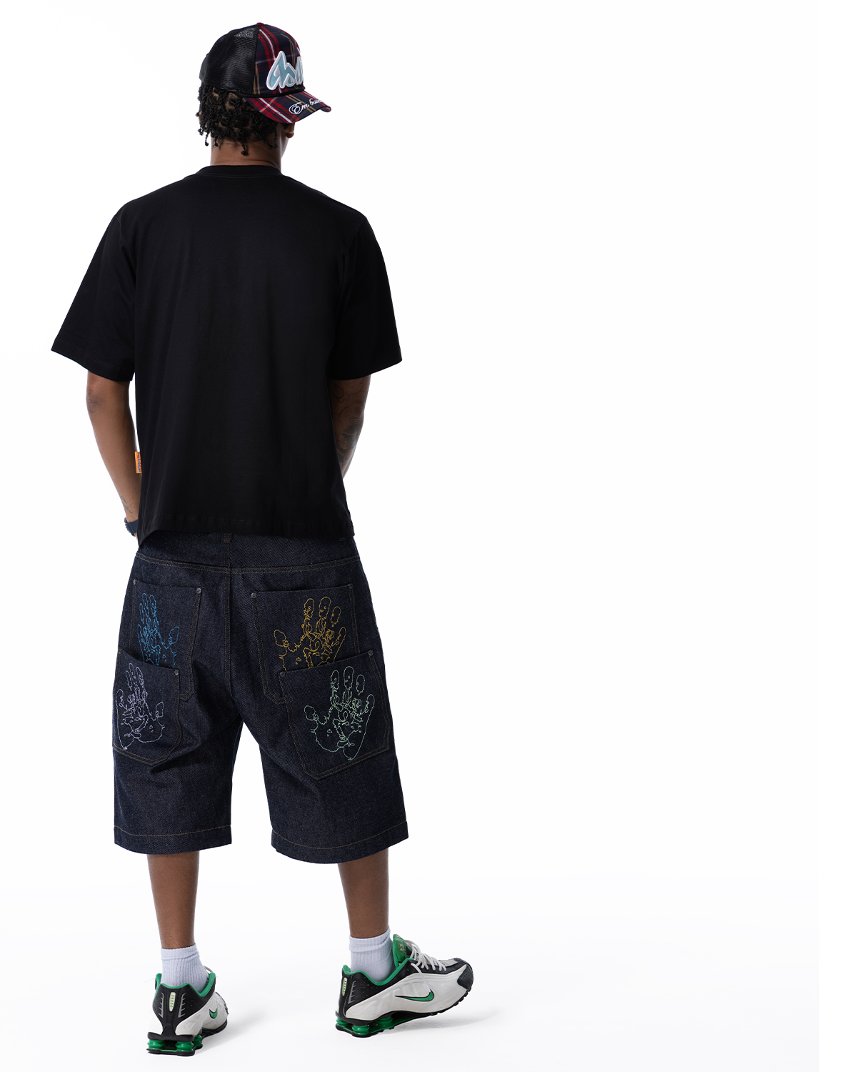 Bermuda Jeans é confeccionada em tecido 100% algodão, modelagem oversized, com dois bolsos frontais e quatro bolsos traseiros com bordado "Mãos da Mad" em 4 cores distintas.