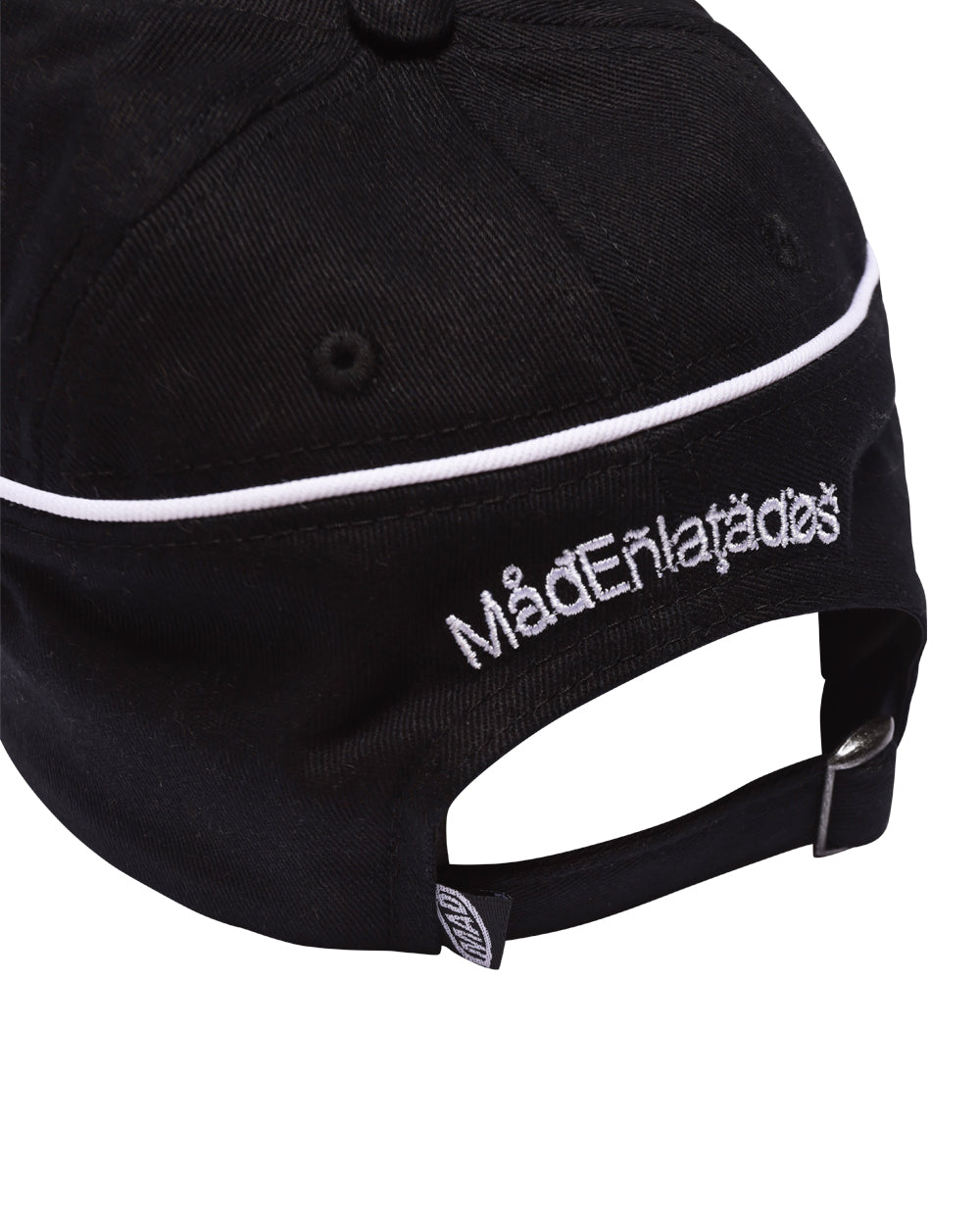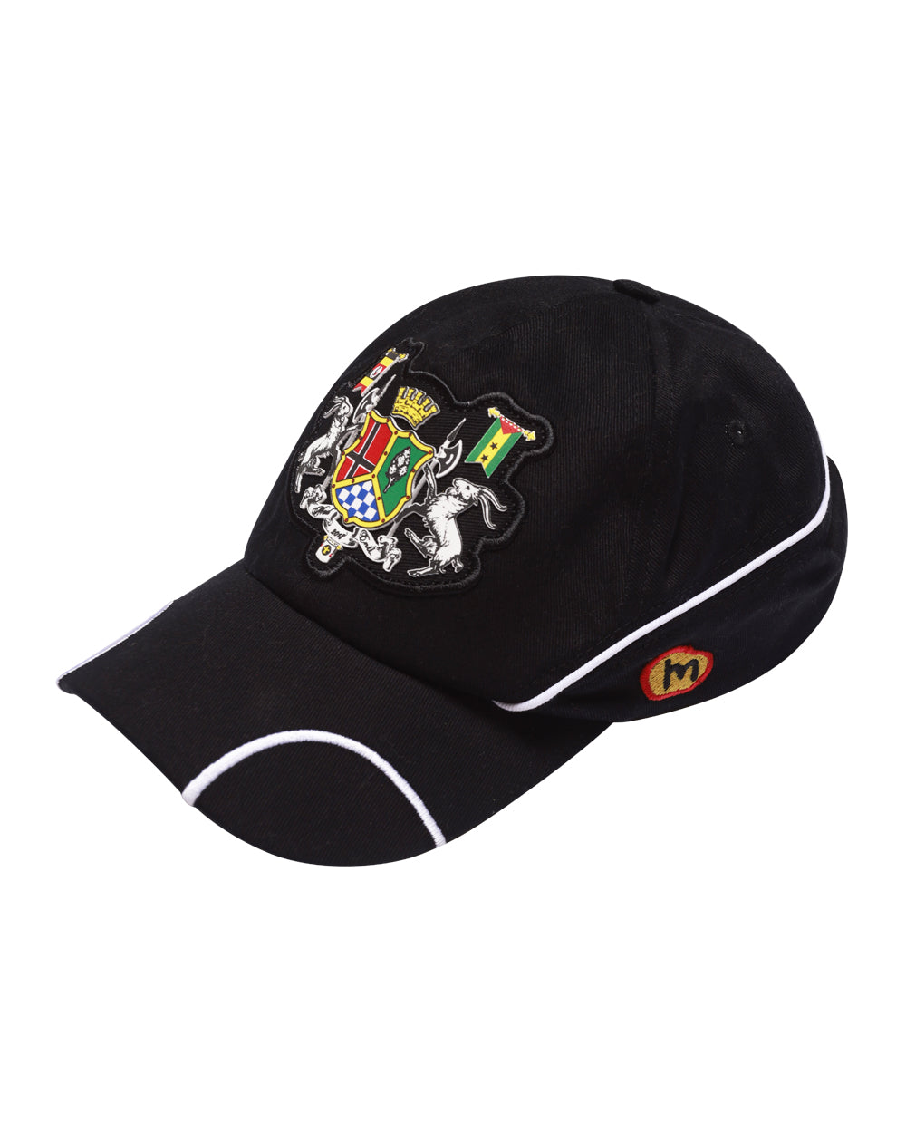 Boné confeccionado em tecido 100% Algodão, modelo baseball-cap mais raso e estampa em aplique emborrachado e sublimado. Recortes e bordados em linha branca. Parte traseira com fecho e regulador metálico.